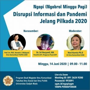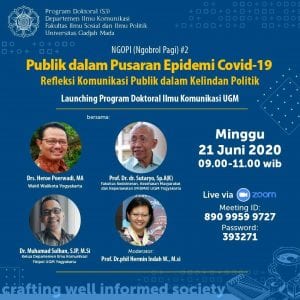 Halo sobat Dikom, Ngopi lagi yuk di minggu pagi ini, Kali ini kita ngobrolin “Publik dalam Pusaran Epidemi Covid-19: Refleksi Komunikasi Publik dalam Kelindan Politik” dengan prof Sutaryo (guru besar dr FKKMK UGM), mas Heroe Poerwadi (wawali Yogya), mas Sulhan (Ketua Aspikom/Ketua Departemen Ilmu Komunikasi UGM), juga mbak Hermin (Sekprodi Prodi S3 Komunikasi UGM). Pagi ini Ngopi spesial karena kami juga akan me-launching Program Doktoral Ilmu Komunikasi UGM yang dibuka oleh Dekan Fisipol UGM, mas Prof Erwan