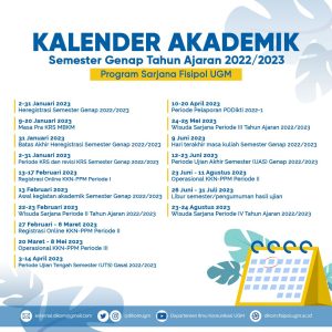 Halo, Sobat Dikom! Sehubungan dengan kegiatan akademik Program Sarjana Semester Genap Tahun Ajaran 2022/2023 yang akan datang sebentar lagi, Dikom menyediakan Kalender Akademik untuk para Sobat Dikom.