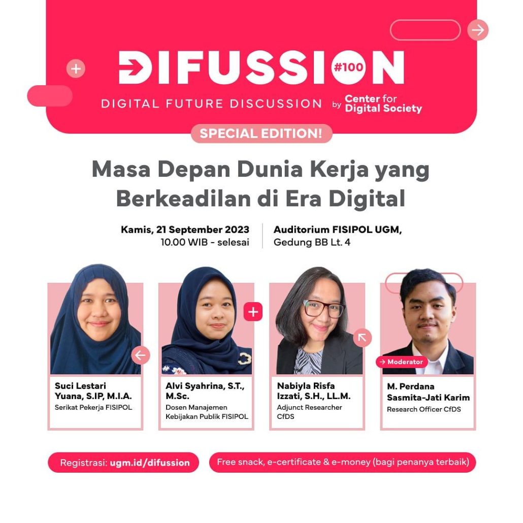 Untuk membahas hal tersebut, CfDS UGM melalui Diffusion #100 menyelenggarakan diskusi bertajuk “Masa Depan Dunia Kerja yang Berkeadilan di Era Digital” dengan pembicara Suci Lestari Yuana, S.I.P, M.I.A. selaku Serikat Pekerja FISIPOL, Alvi Syahrina, S.T., M.Sc. selaku Dosen Manajemen Kebijakan Publik FISIPOL UGM, dan Nabiyla Risfa Izzati, S.H., L.L.M. selaku Adjunct Researcher CfDS.