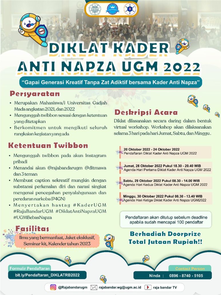 Diklat Kader Anti Napza UGM 2022 kembali hadir dengan tajuk “Gapai Generasi Kreatif Zat Adiktif bersama Kader Anti Napza.” Bagi Sobat Dikom yang tertarik untuk mendaftarkan diri, terdapat beberapa persyaratan, yaitu: