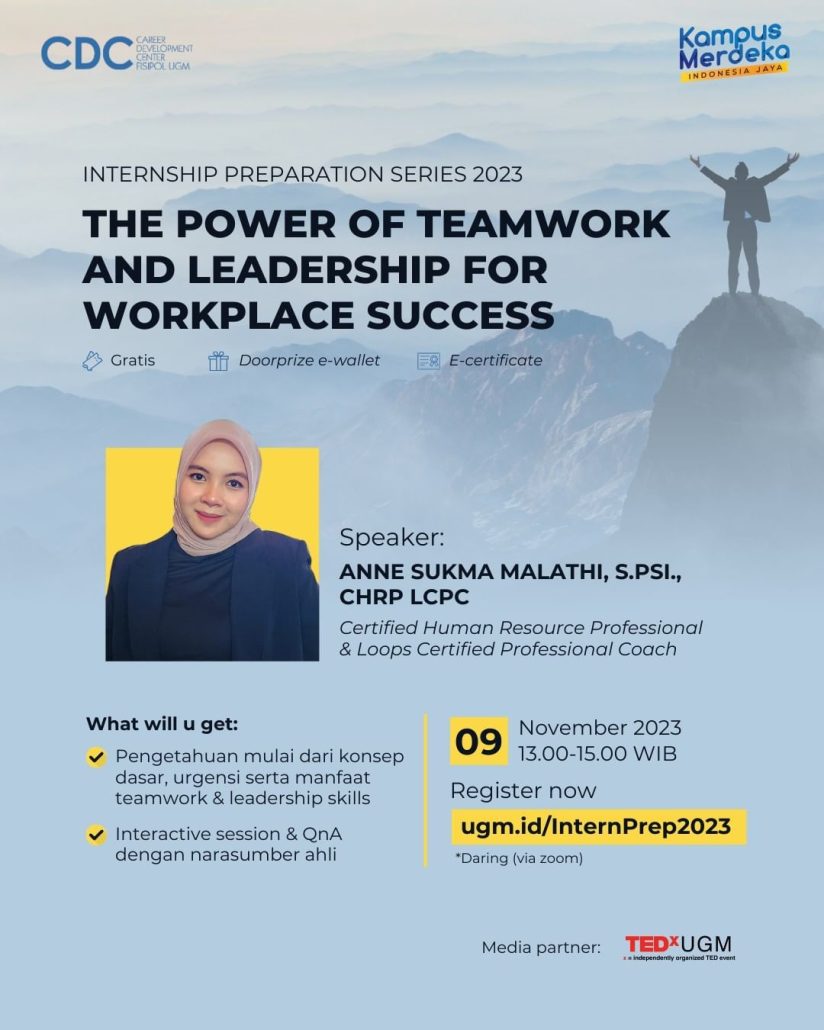 Saat ini, CDC Fisipol UGM kembali menghadirkan Internship Preparation Series bertajuk “The Power of Teamwork and Leadership for Workplace Success.”