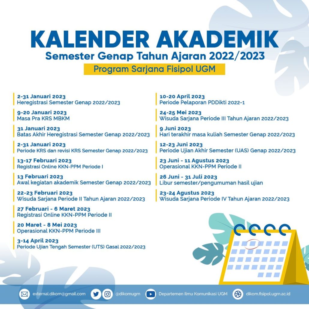 Agenda-agenda dalam Kalender Akademik Semester Genap Tahun Ajaran 2022/2023 Fisipol UGM adalah sebagai berikut: