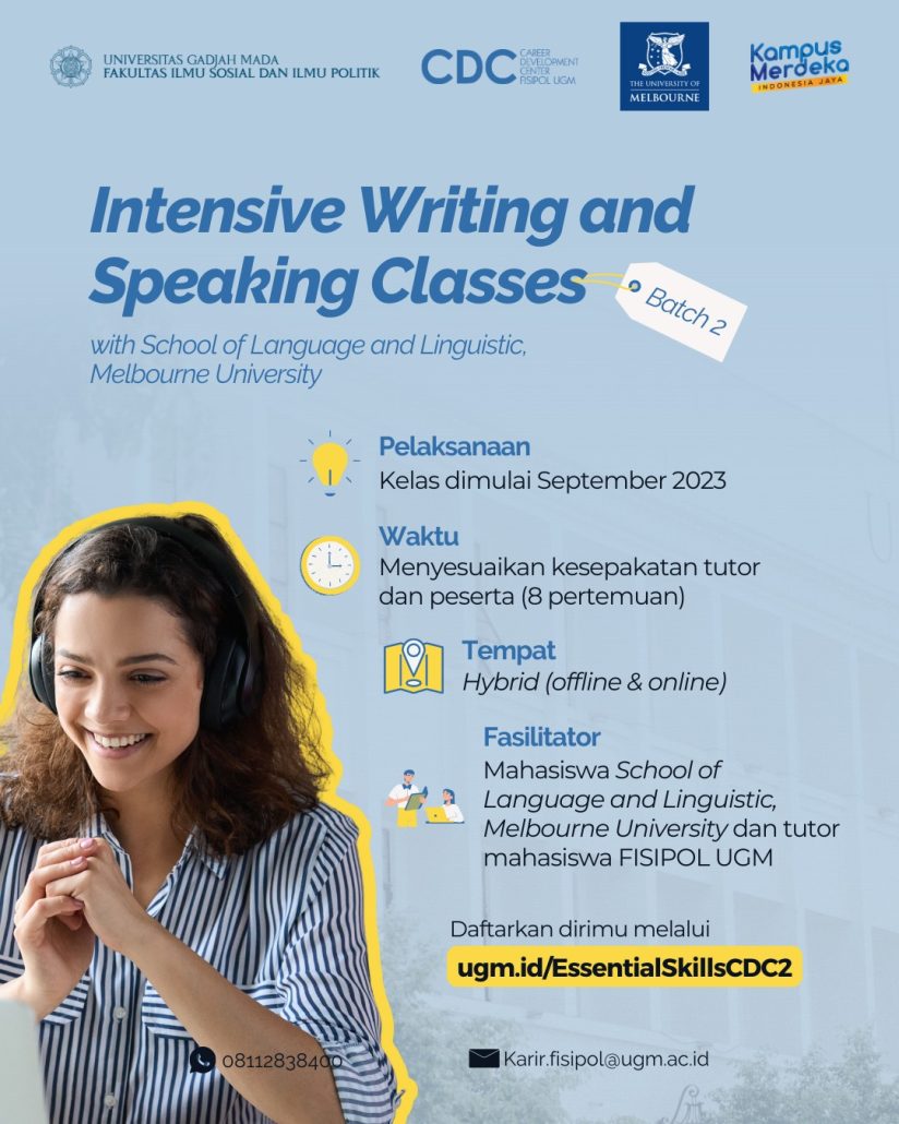 Kini, Fakultas Ilmu Sosial dan Ilmu Politik UGM berkolaborasi dengan School of Language and Linguistic, Melbourne University tengah menyelenggarakan kelas Intensive Writing and Speaking Classes.