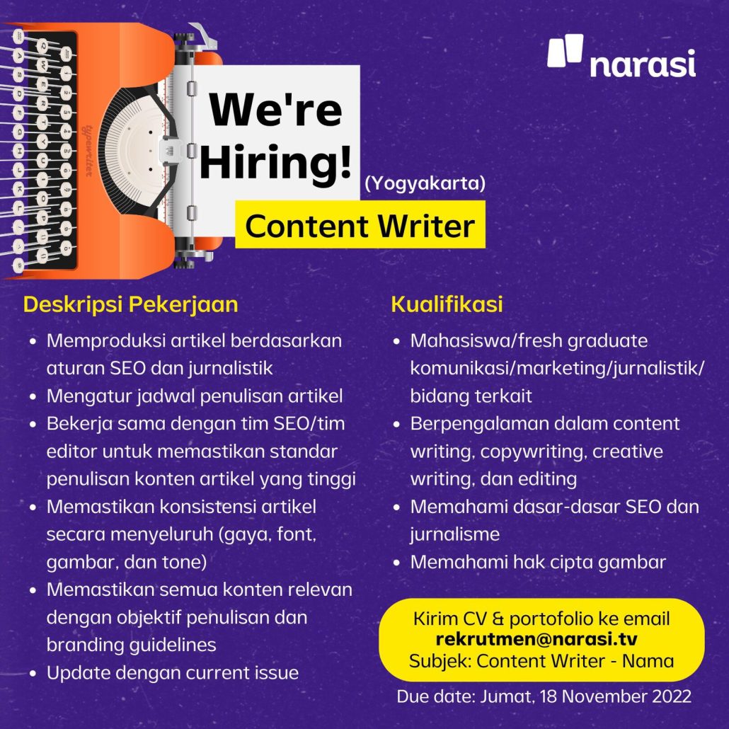 Teruntuk Sobat Dikom yang tengah mencari lowongan magang, Dikom punya informasi penting untuk kamu. Kini, telah dibuka lowongan Content Writer di Narasi domisili Yogyakarta. Terkait deskripsi pekerjaan, terdapat beberapa kegiatan atau aktivitas kerja yang akan dilakukan, yaitu: