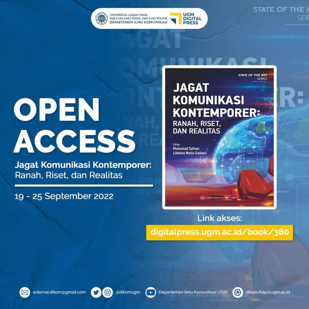 Ada kabar gembira spesial untuk Sobat Dikom, nih! Kini, buku Jagat Komunikasi Kontemporer: Ranah, Riset, dan Realitas kembali open access. Sobat Dikom sekarang bisa mengakses buku ini secara gratis, pun menyebarkannya kepada teman, saudara, dan keluarga terdekat.