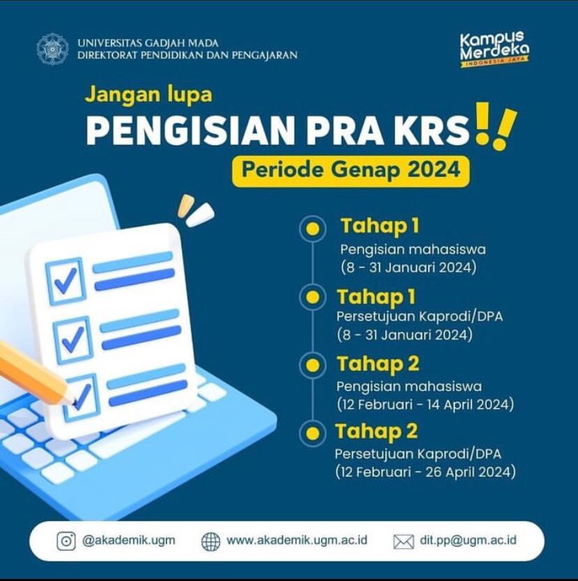 Panduan pengisian Pra KRS dapat Sobat Dikom akses melalui tautan merdekabelajar.ugm.ac.id/panduan-pra-krs/ dan usulan penambahan kegiatan SI MBKM dapat diakses melalui tautan ugm.id/UsulanKegiatanSIMBKM.
