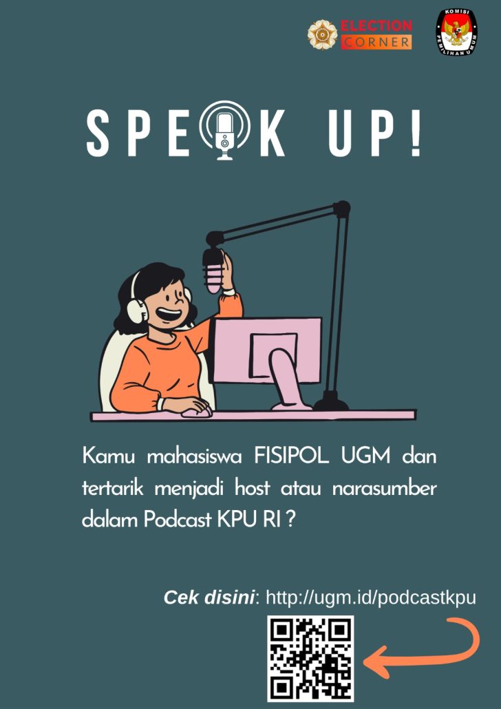 Saat ini, Program Election Corner FISIPOL UGM (EC FISIPOL UGM) tengah mengundang para mahasiswa aktif FISIPOL UGM untuk terlibat dalam podcast kepemiluan bersama Komisi Pemilihan Umum Republik Indonesia (KPU RI). Dalam podcast yang akan diproduksi, tema besar yang diambil adalah “Harapan Generasi Muda terhadap Pemilu 2024”.