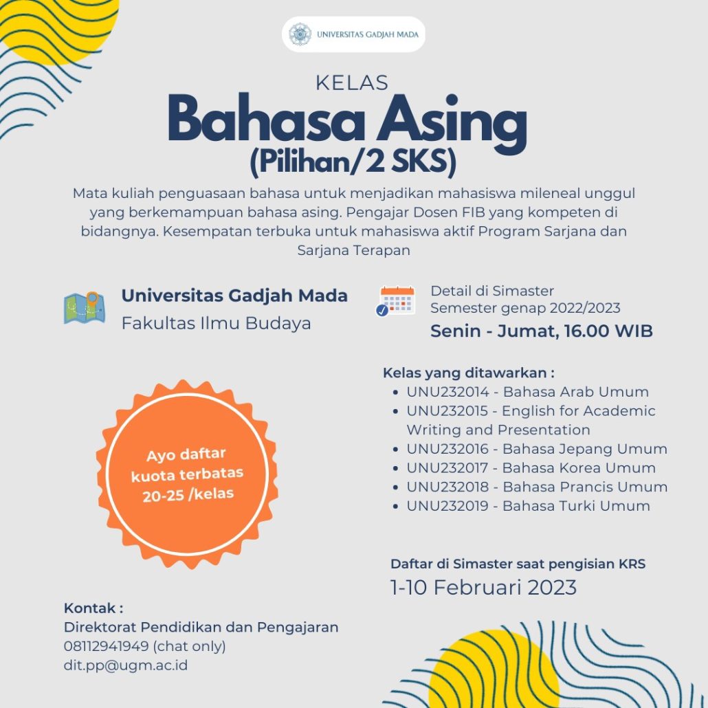 Bagi Sobat Dikom yang ingin mempelajari bahasa asing, UGM menyediakan fasilitasi Program Kelas Bahasa Asing yg diselenggarakan di FIB UGM. Program ini terbuka untuk seluruh mahasiswa Sarjana dan Sarjana Terapan secara gratis, tanpa dipungut biaya apapun.