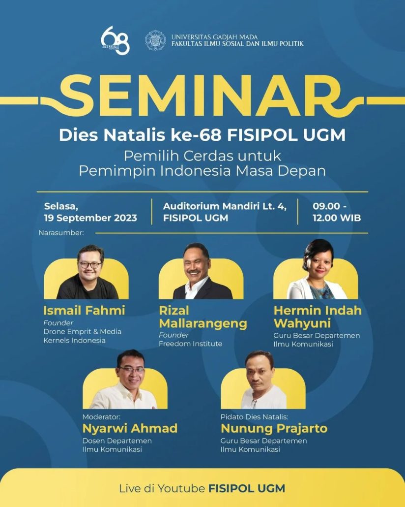 - Tempat: Auditorium Mandiri Lantai 4 FISIPOL UGM dan kanal YouTube Fisipol UGM