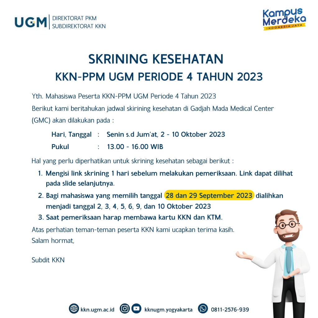 Bagi sobat yang mengikuti KKN-PPM UGM Periode 4 Tahun 2023, skrining kesehatan KKN-PPM akan diselenggarakan pada: