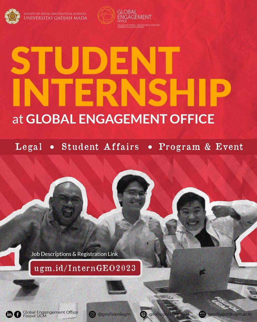 Saat ini, Global Engagement Office Fisipol UGM tengah membuka lowongan magang dalam divisi Legal, Student Affairs, dan Program & Event periode Oktober–Desember 2023.