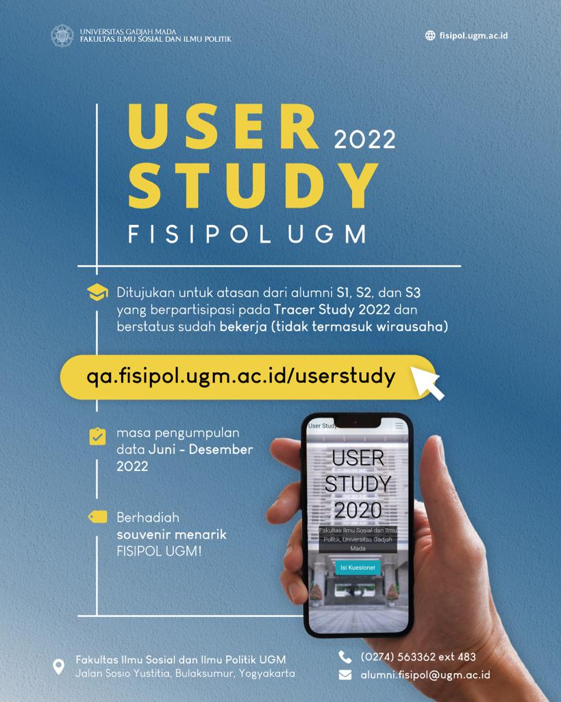 Diperuntukkan kepada alumni S1, S2, dan S3 yang berpartisipasi pada Tracer Study 2022 dan berstatus sudah bekerja (tidak termasuk wirausaha), kini tengah dilaksanakan survei User Study Fisipol UGM 2022.