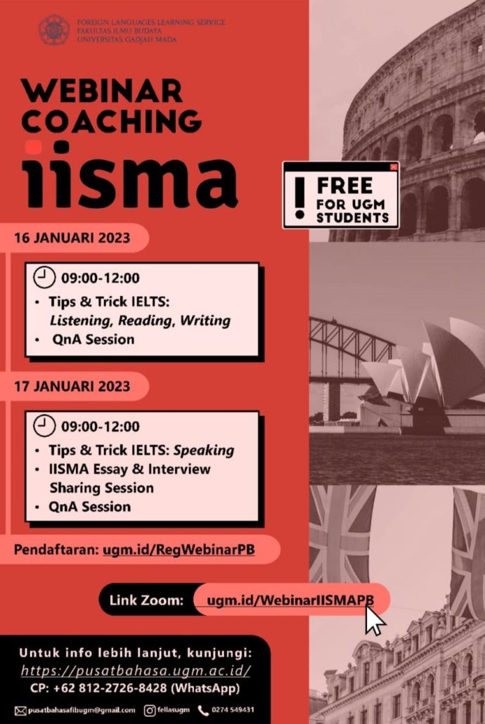 Bagi Sobat Dikom yang tertarik dengan program Exchange, kini segera diselenggarakan Webinar Coaching IISMA dari Fakultas Ilmu Budaya UGM. Pada acara tersebut, sobat dapat berbincang dengan alumni-alumni IISMA beserta dosen-dosen yang akan membantumu menjawab pertanyaan-pertanyaan tentang program tersebut.