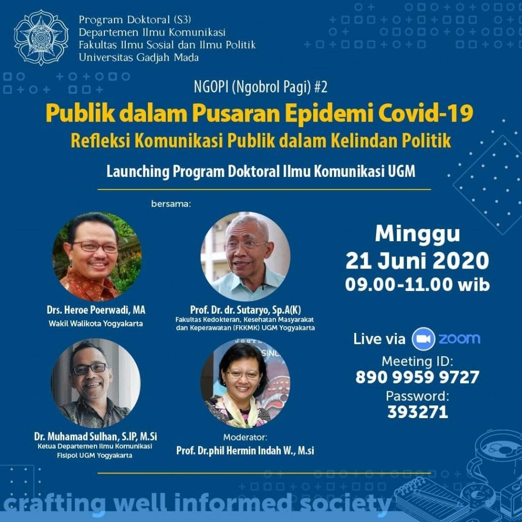 Kali ini kita ngobrolin “Publik dalam Pusaran Epidemi Covid-19: Refleksi Komunikasi Publik dalam Kelindan Politik” dengan prof Sutaryo (guru besar dr FKKMK UGM), mas Heroe Poerwadi (wawali Yogya), mas Sulhan (Ketua Aspikom/Ketua Departemen Ilmu Komunikasi UGM), juga mbak Hermin (Sekprodi Prodi S3 Komunikasi UGM).