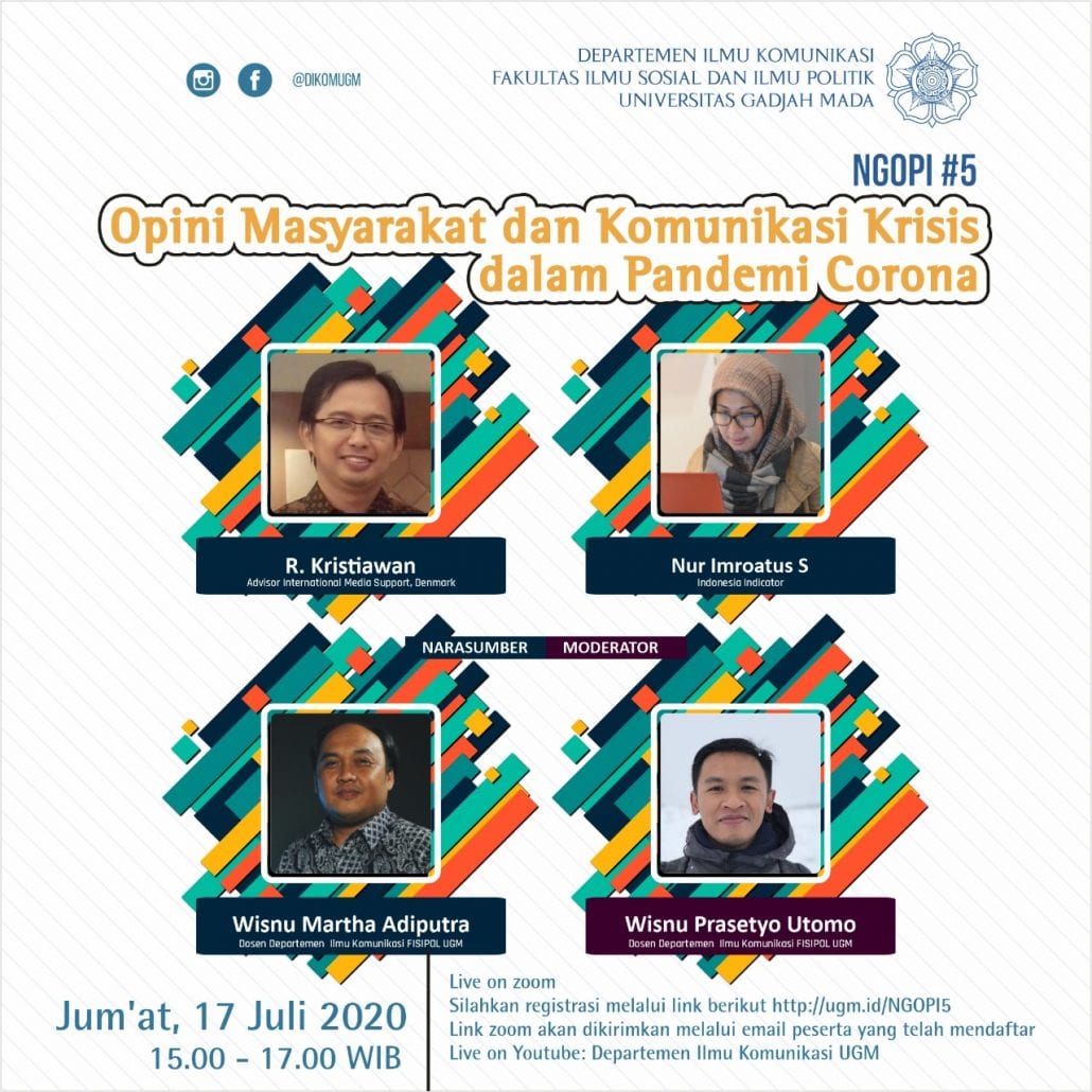 Kali ini, kita bakal ngobrolin tentang “Opini Masyarakat dan Komunikasi Krisis dalam Pandemi Corona” bareng narasumber kita: