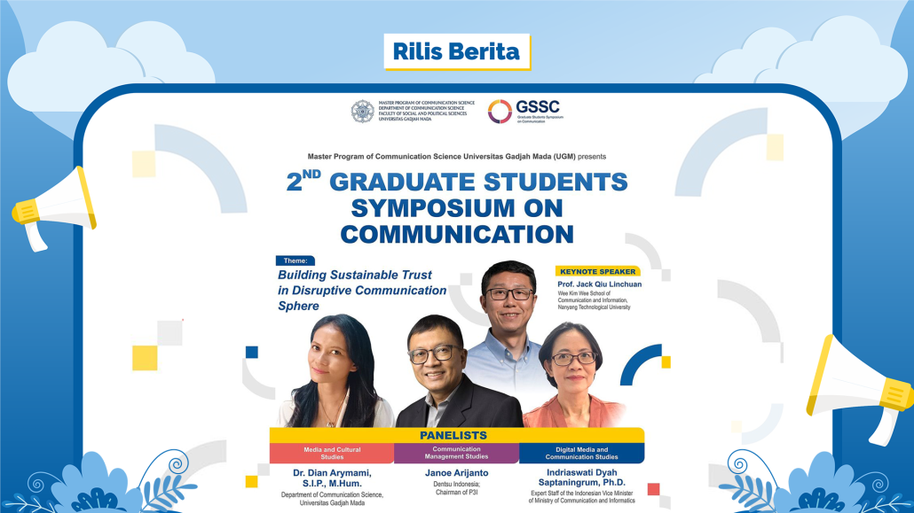 Program Studi Magister Ilmu Komunikasi Universitas Gadjah Mada (UGM) menyelenggarakan kembali “2nd Graduate Student Symposium on Communication” (GSSC) 2023. Acara yang diselenggarakan di University Club (UC) Hotel UGM ini mengusung tema, yaitu “Building Sustainable Trust in Disruptive Communication Sphere”.