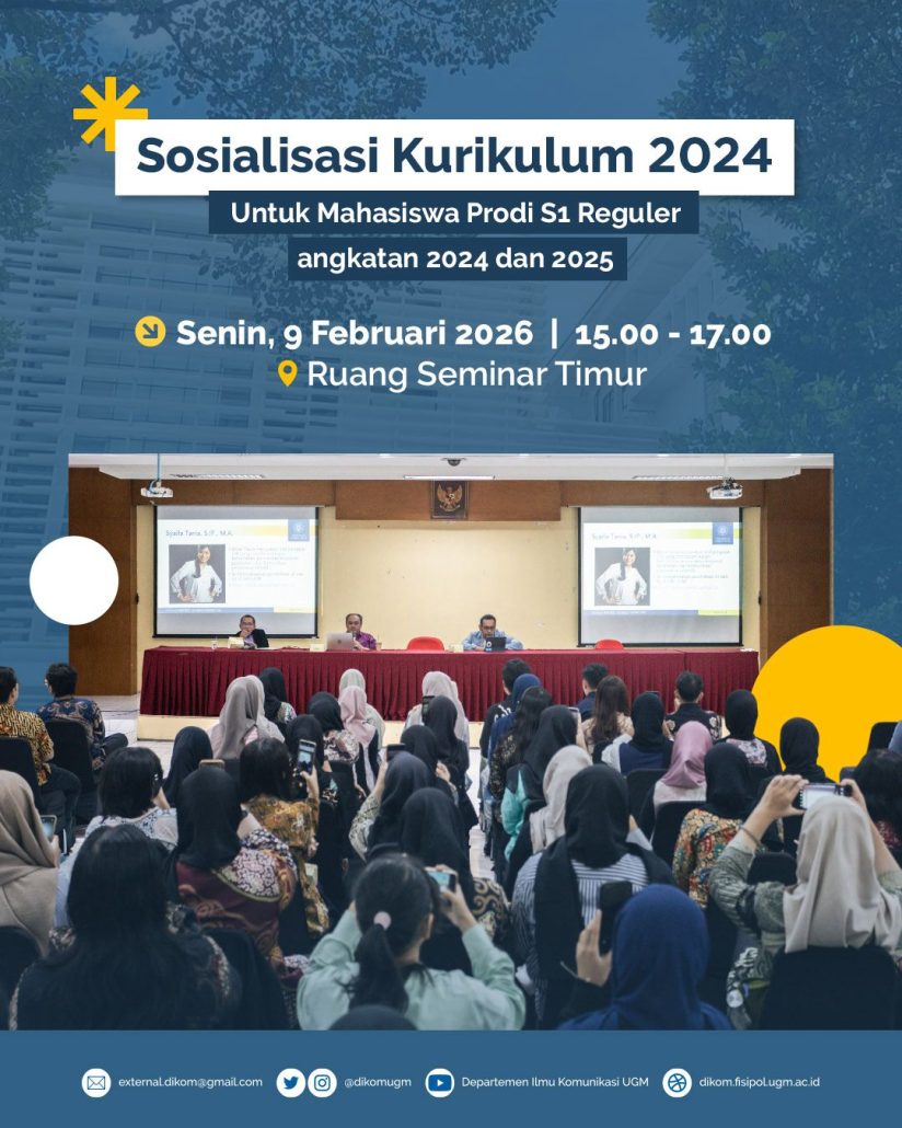 Yogyakarta, 9 Februari 2026 – Departemen Ilmu Komunikasi menyelenggarakan kegiatan sosialisasi kurikulum pada Senin, 9 Februari 2024, pukul 15.00–17.00 WIB di Ruang Seminar Timur, Fakultas Ilmu Sosial dan Ilmu Politik. Kegiatan ini dihadiri oleh mahasiswa Program Studi S1 Reguler Ilmu Komunikasi angkatan 2024 dan 2025. Sosialisasi tersebut bertujuan untuk memberikan pemahaman menyeluruh mengenai arah dan pembaruan kurikulum yang akan diterapkan. Acara dibuka sekaligus diisi dengan pemaparan materi oleh Sekretaris Program Studi S1 Ilmu Komunikasi, Mashita Phitaloka Fandia Purwaningtyas, S.I.P., M.A.